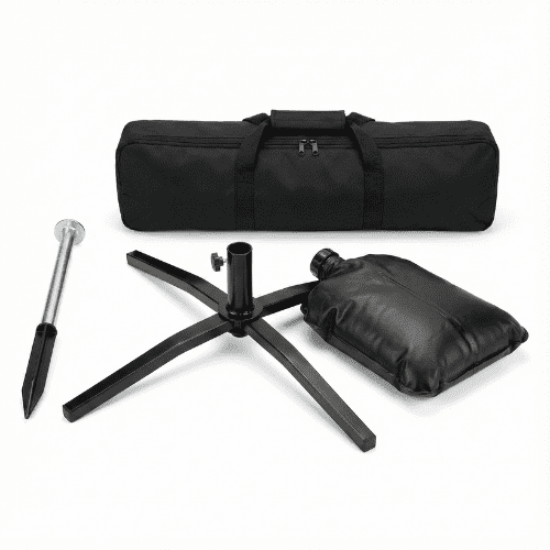 Optional accessories include ground spikes, cross bases, water weights, and carrying cases to stabilize displays in any environment.